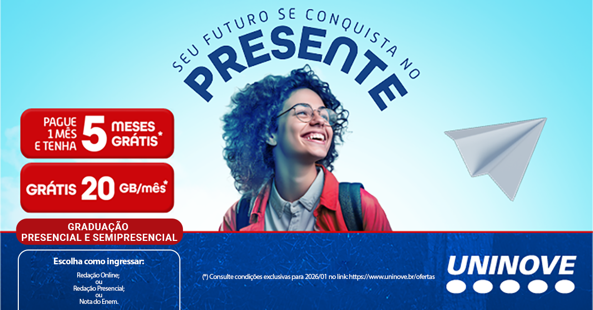 *Valor com desconto extraordinário e exclusivo para o 1º semestre letivo (civil) de 2026. Vencimento da mensalidade todo dia 07 de cada mês. Valor exclusivo para aluno ingressante no 1º semestre letivo (civil) de 2026, no 1º semestre do curso. Maiores informações e ofertas, consulte o Regulamento no link https://www.uninove.br/ofertas